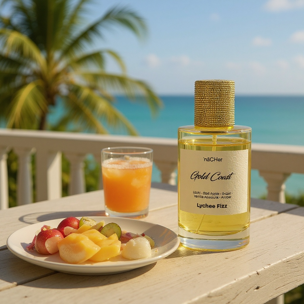 In the base, Lychee Fizz settles into a warm and indulgent foundation of sugar, vanilla absolute, musk, amber, sandalwood, and cedar. The sugar offers a delectable sweetness that enhances the overall gourmand aspect, while vanilla absolute adds a creamy, comforting richness. Musk contributes a soft, sensual warmth that lingers on the skin, while amber adds a warm, resinous depth. Sandalwood and cedar introduce earthy, woody notes that ground the composition, adding complexity and sophistication.